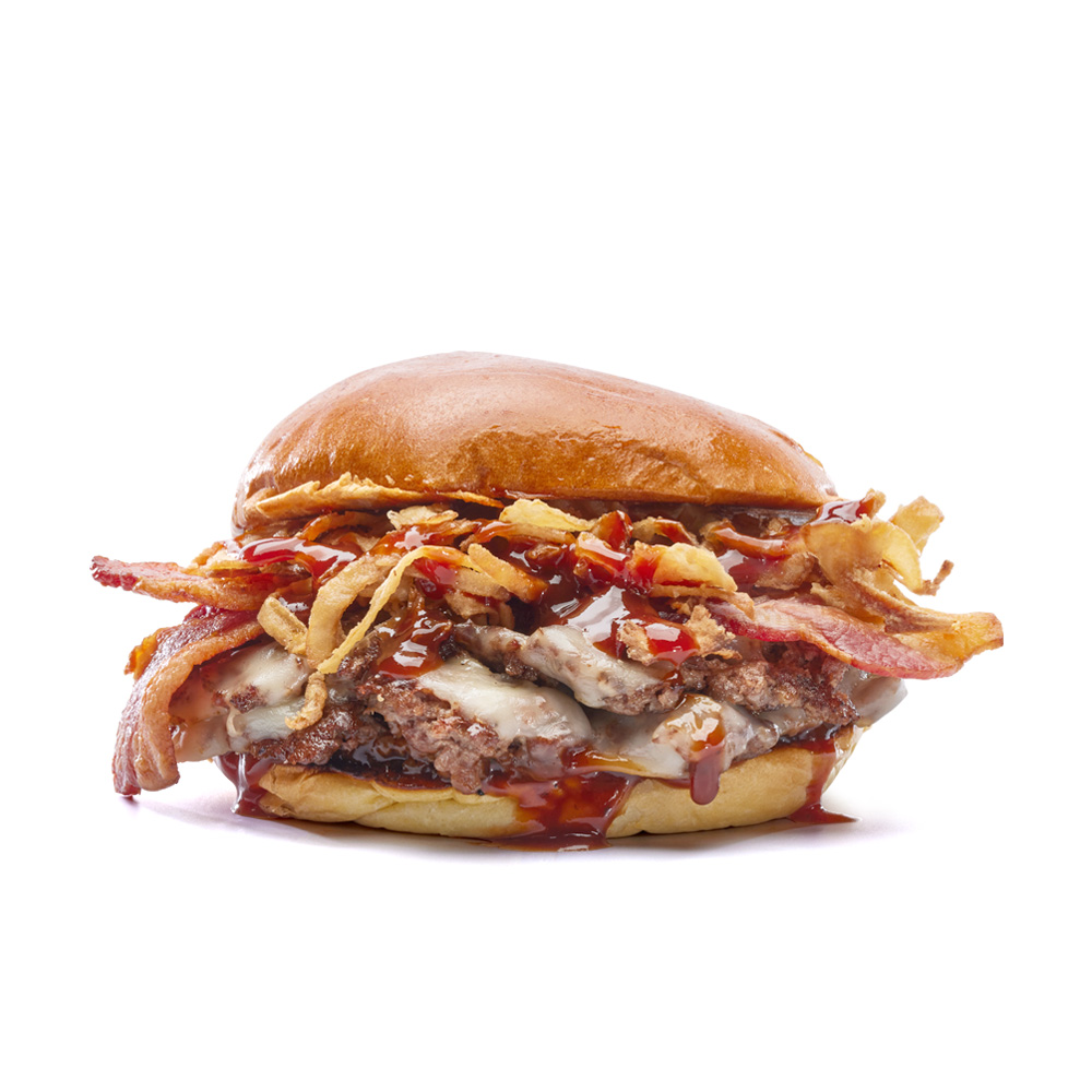 2 galettes de 3.5oz, fromage Monterey Jack, bacon, cornichons, oignons frits et sauce BBQ.