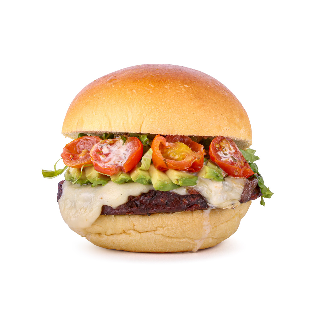 Pain burger, galette végétarienne aux haricots noirs, fromage suisse, avocat, laitue, tomates rôties, et sauce ranch.