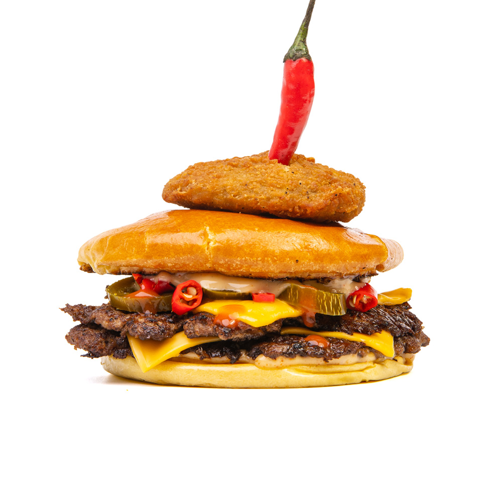 2 galettes de bœuf de 3.5oz, fromage cheddar, jalapeño, piment chili thaï, mayo épicée, garni d’un piment jalapeño frit et sauce épicée. Pas pour les peureux.