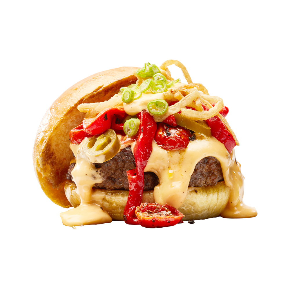 Galette de boeuf, sauce au fromage suprême, jalapeños, poivrons rouges rôtis, tomates rôties, oignons frits et oignons verts.
