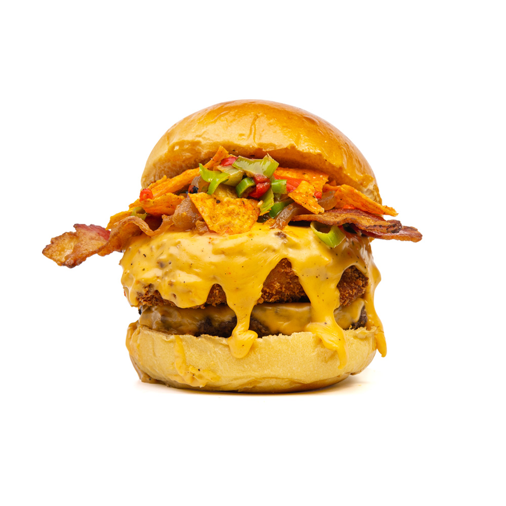 Galette de bœuf de 5oz, galette de macaroni au fromage frite, fromage cheddar, bacon, oignons caramélisés, poivrons rouges rôtis, poireaux, Doritos et sauce au fromage.
