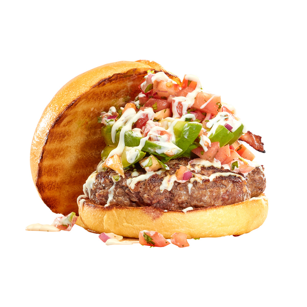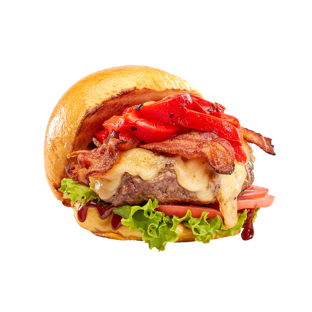 Galette de boeuf, fromage Monterey Jack, poivrons rouges rôtis, bacon, tomates, laitue, sauce BBQ et une pincée de poivre de cayenne.