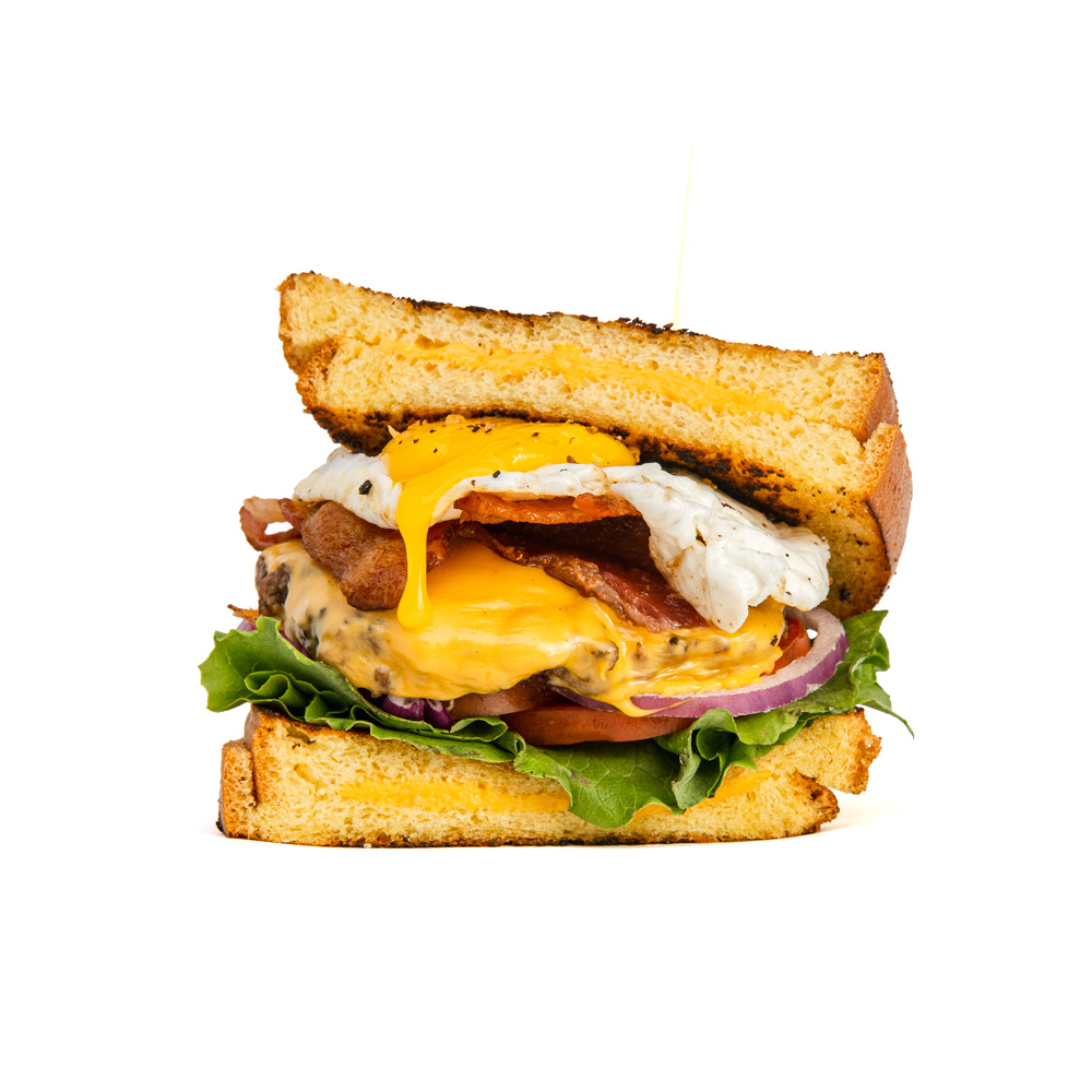 Grilled cheese, galette de boeuf 5oz, oeuf frit, bacon, mayo, laitue, tomates, oignons et un autre grilled cheese.