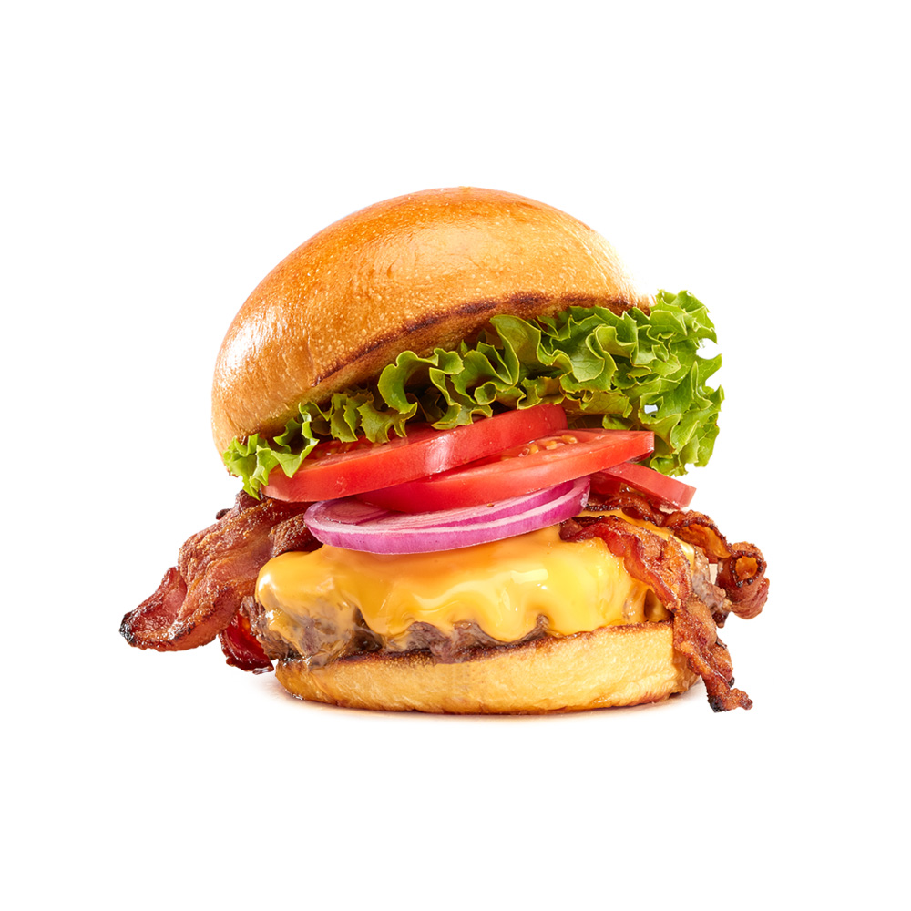 Galette de boeuf, fromage cheddar, bacon, oignons rouges, tomates et laitue.