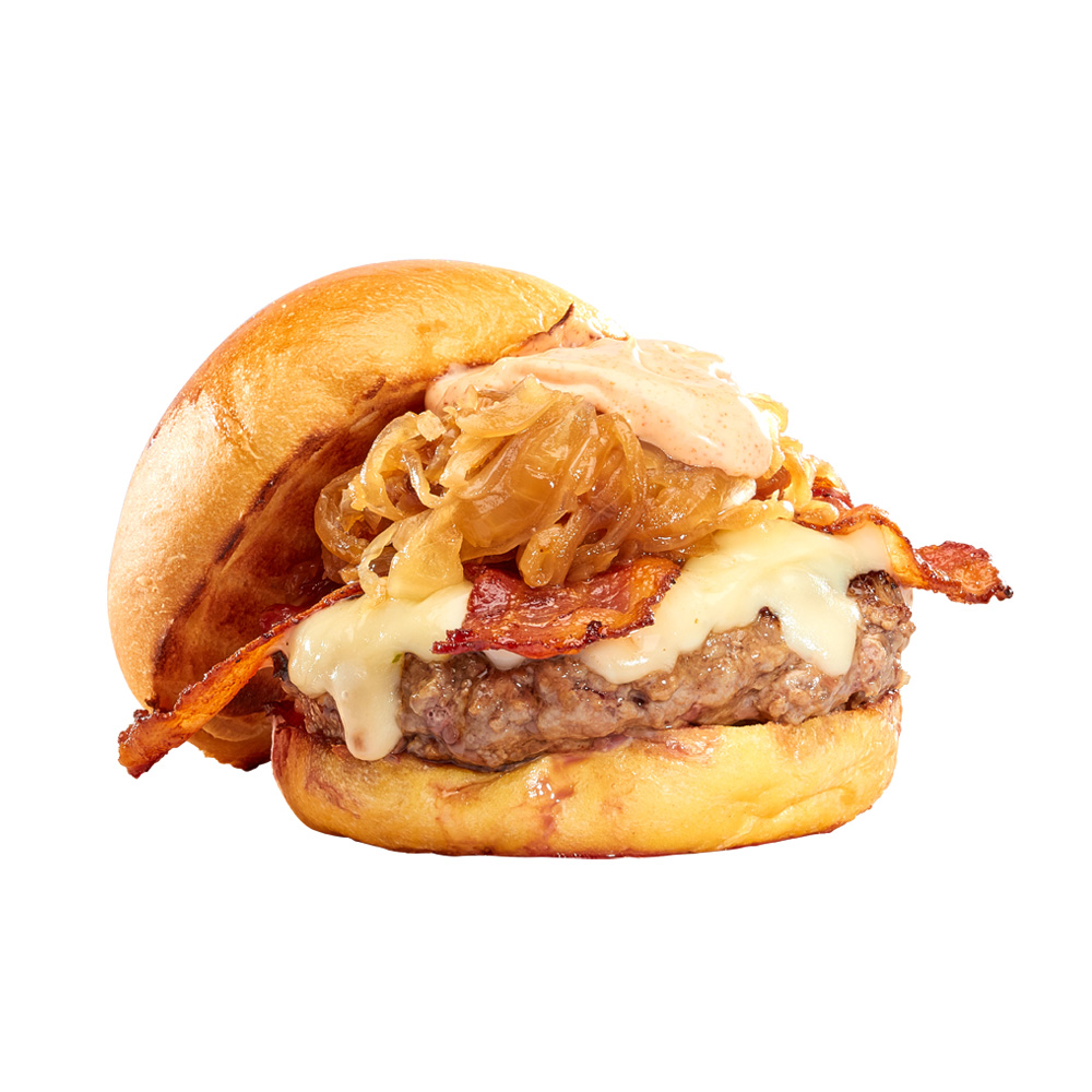 Galette de boeuf, fromage Monterey Jack, bacon, oignons caramélisés et mayo épicée.
