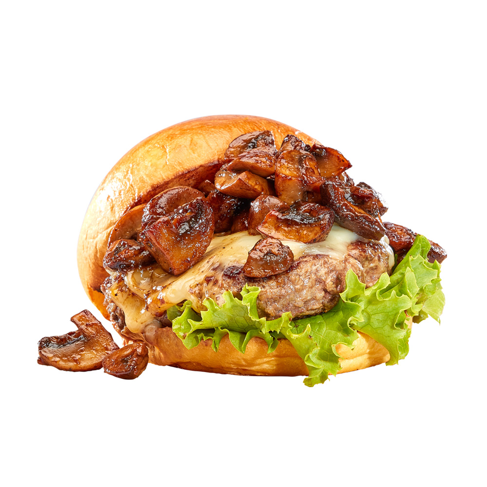 Galette de boeuf, fromage suisse, champignons sautés dans une sauce au vin rouge, oignons caramélisés, laitue et oignons verts.