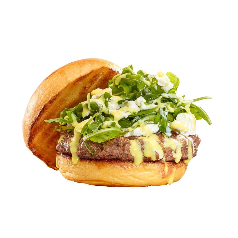 Galette de boeuf, fromage de chèvre émietté, roquette et sauce moutarde et miel.