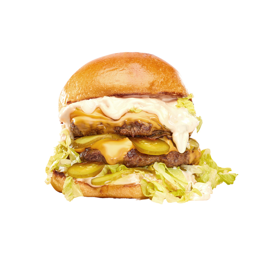 Deux galettes de bœuf de 5oz, sauce secrète, fromage cheddar, oignons hachés, laitue hachée et tranches de cornichons.