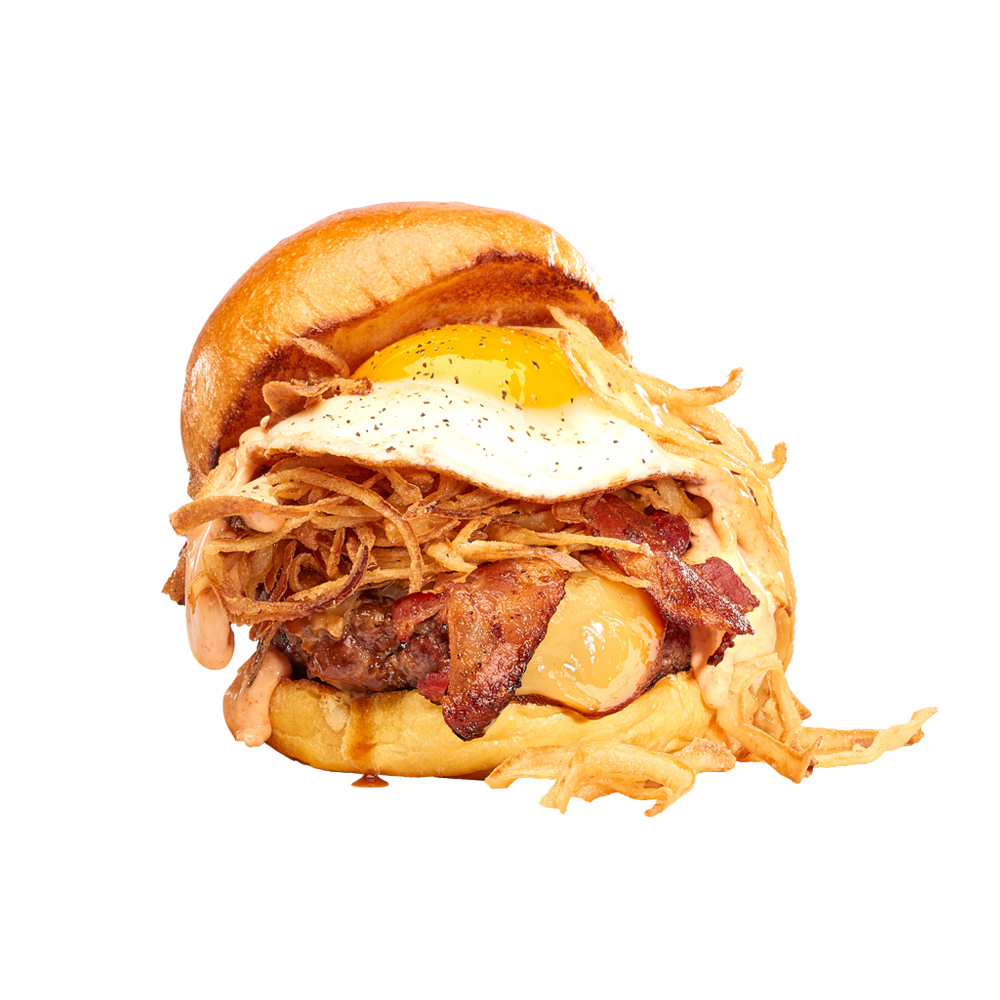 Galette de boeuf, oeuf frit, bacon, fromage gouda fumé, laitue, oignons frits et mayo épicée.