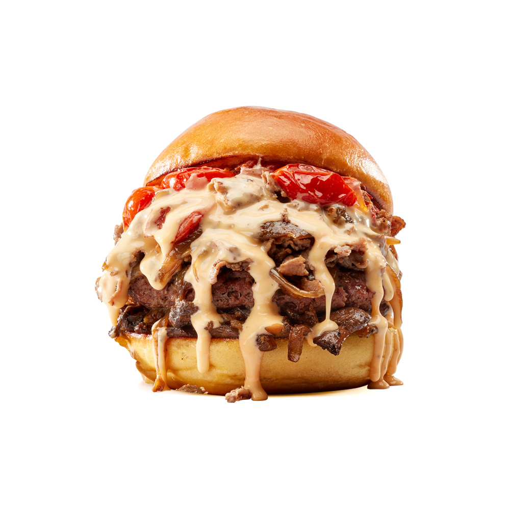 Galette de bœuf de 5oz, steak Philly, oignons caramélisés, champignons sautés, tomates rôties et sauce au fromage suprême.