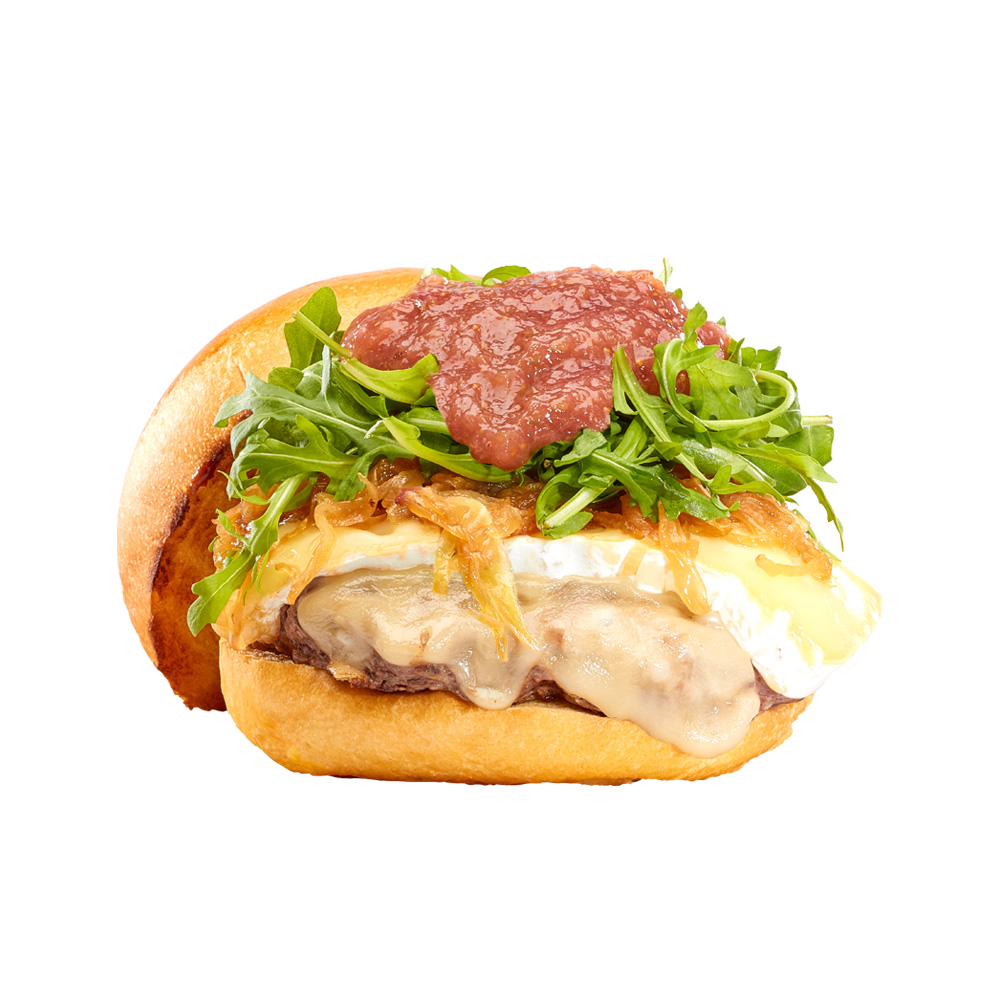 Galette de boeuf, fromages brie et Monterey Jack, gelée de figue, roquette et oignons caramélisés.