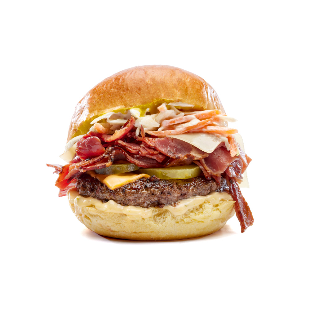 Galette de bœuf de 5oz, viande fumée, fromage cheddar, fromage suisse, salade de chou, cornichons, moutarde et sauce secrète.