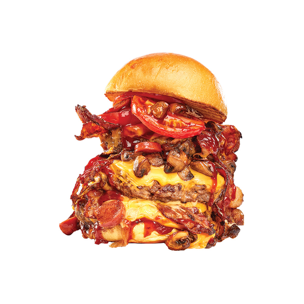 Triple galette de boeuf, triple fromage cheddar, triple bacon, saucisse hotdog, champignons sautés, oignons caramélisés, laitue, tomates et sauce BBQ.