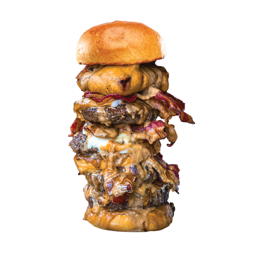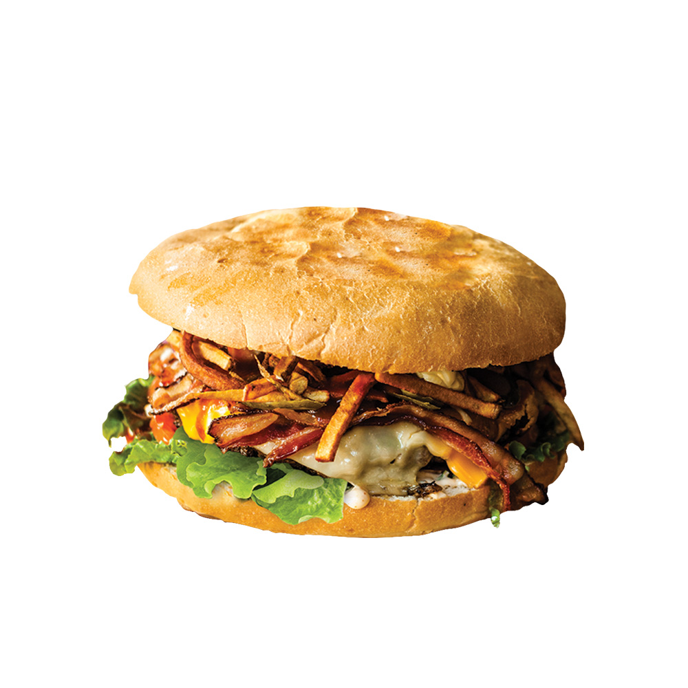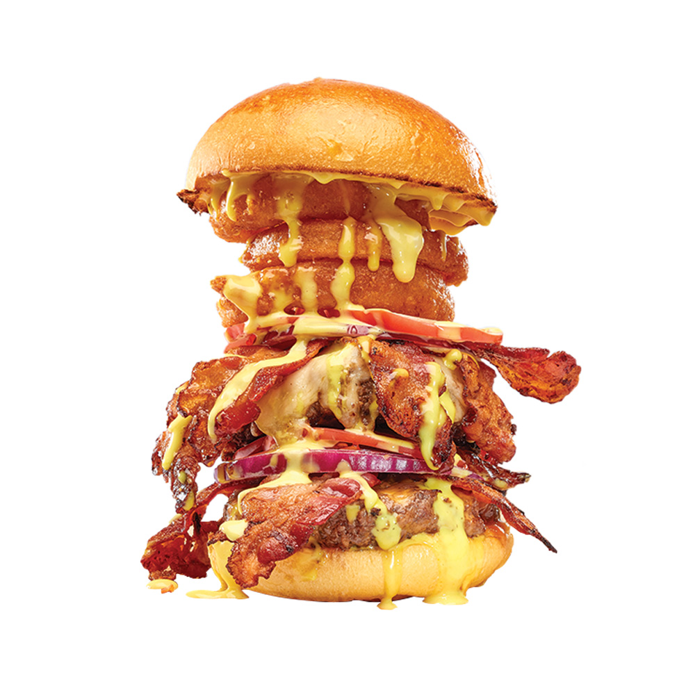 Double galette de boeuf, fromage cheddar, Monterey Jack, double bacon, rondelles d’oignons, tomates, oignons rouges, laitue et mayonnaise à la moutarde.