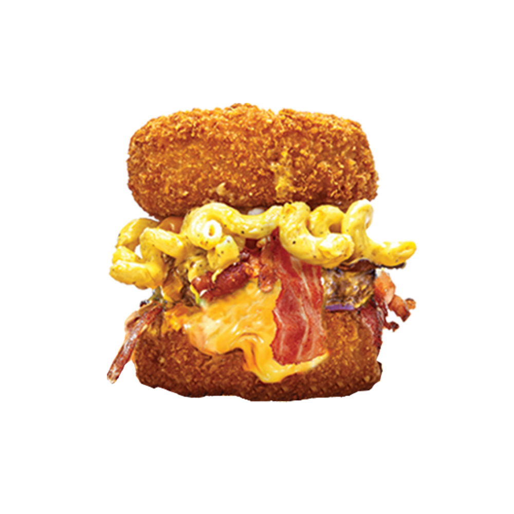 Deux galettes de macaroni au fromage frite, galette de boeuf de 8oz, fromage cheddar, bacon, mac‘n cheese, oignons caramélisés, oignons rouges, mayonnaise et sauce au fromage.