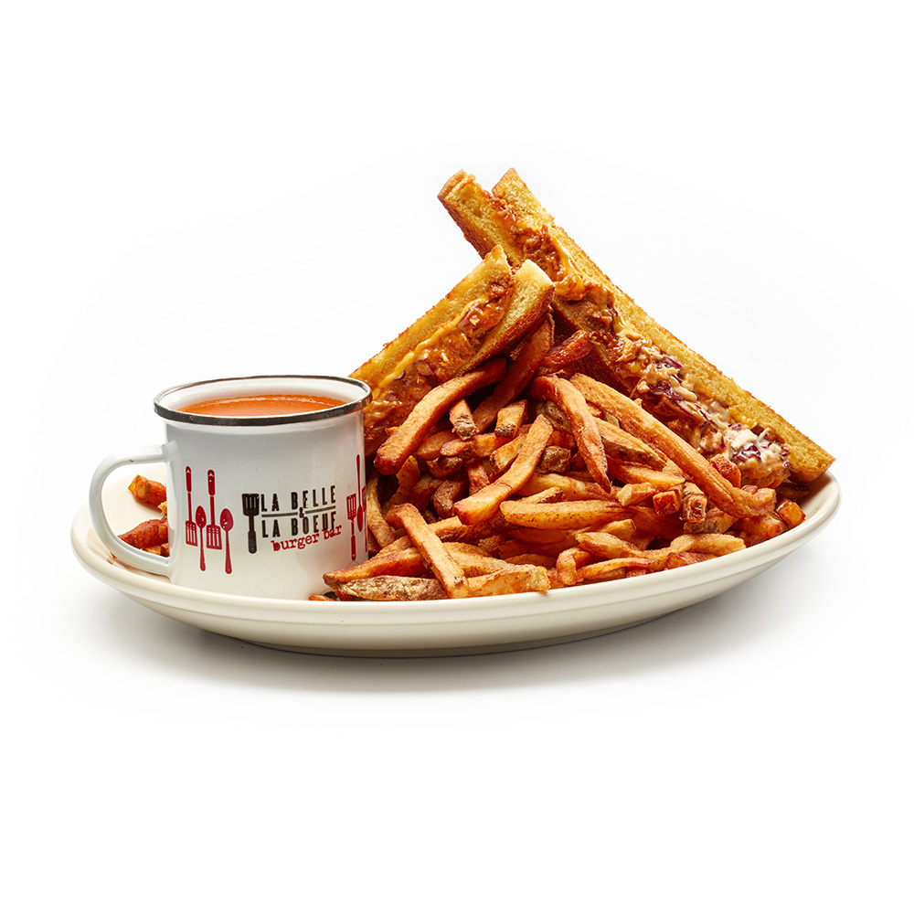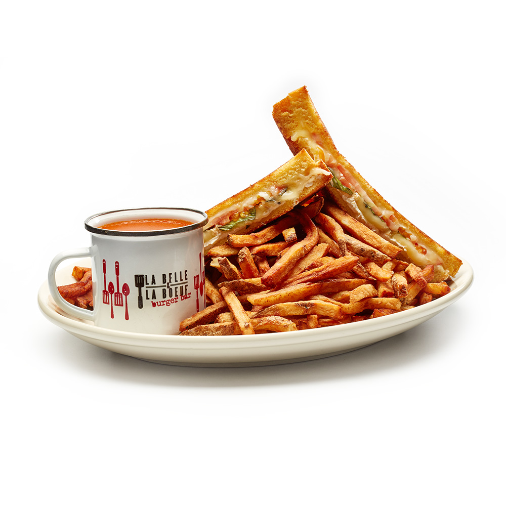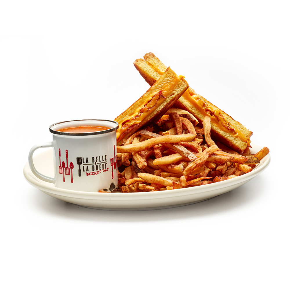 Croustillant à l’extérieur, fondant au milieu. Le grilled cheese rappelle le confort de notre maman peu importe comment tu l’tranches. Sont servis avec frites ou patates pilées ou salade maison avec une crème de tomate Campbell’s pour y tremper ton pain.