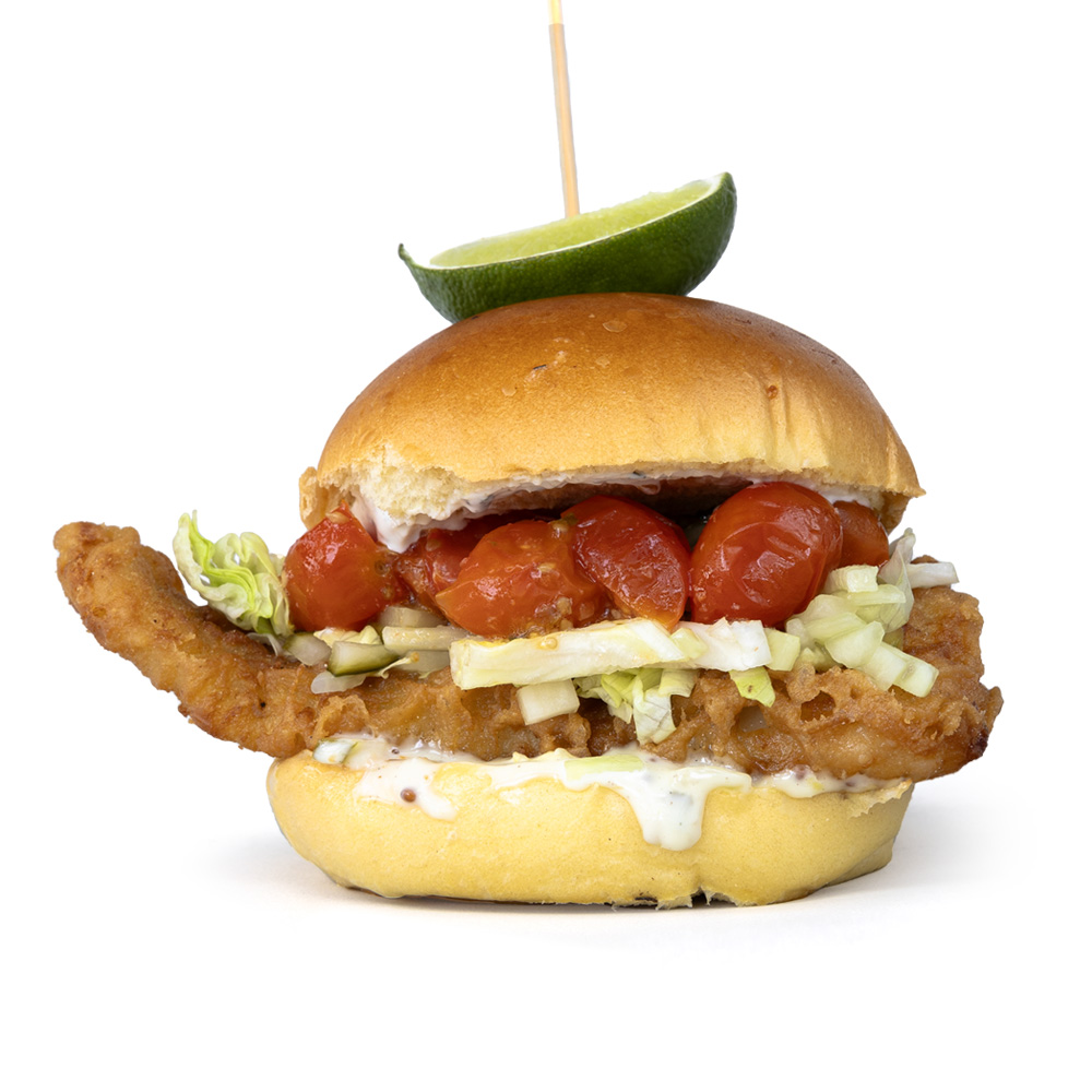 Pain burger, filet de morue croustillante panée à la bière, concombre, laitue, tomates rôties, sauce tartare et quartier de lime.