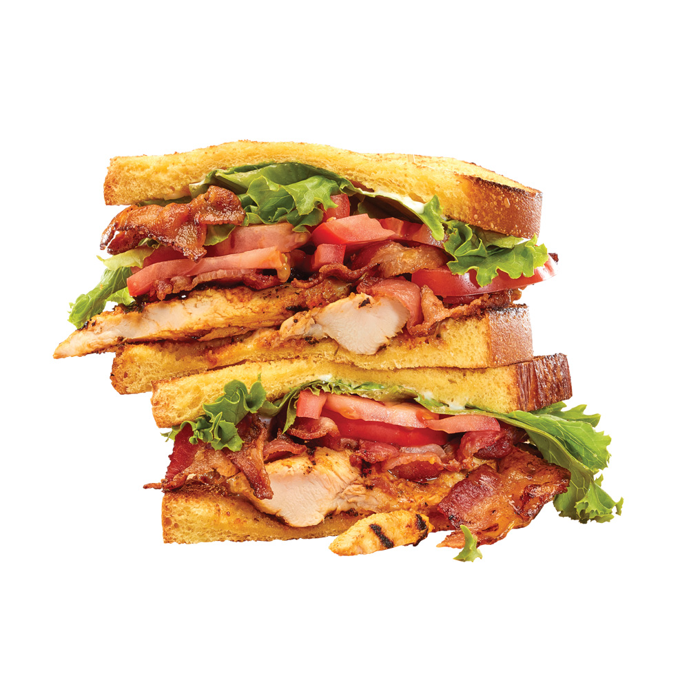 Pain de campagne, poitrine de poulet grillée, bacon, laitue, tomate et mayo.