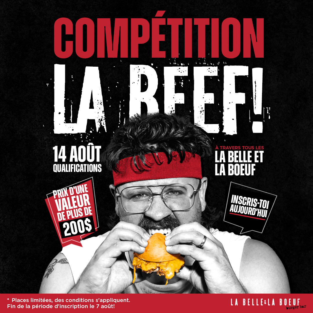 Les champions de chaque succursale remporteront une carte-cadeau de 200 $ et seront invités à notre Grande Finale, le 21 août, au La Belle et La Bœuf Centropolis, pour défendre leur titre et tenter de décrocher la victoire 🐄💪 Le grand gagnant se verra couronné LA BEEF et remportera un grand prix d’une valeur de plus de 500 $ ! 🎉🔥